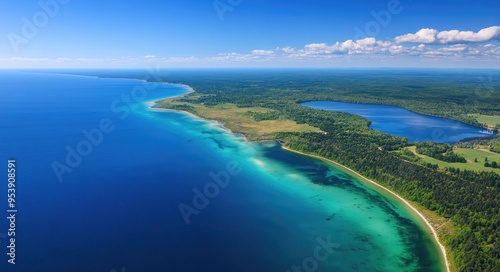 © Serhii, Obraz premium Aerial View of Elk Rapids, Elk Lake, and Lake Michigan: A Tranquil Blue Landscape