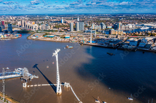 © Aerial Film Studio, Naklejka premium Aerial view of Emirates Air Line cable cars. The service is the UK's first urban cable car running across the Thames from the O2 to the Excel centre.