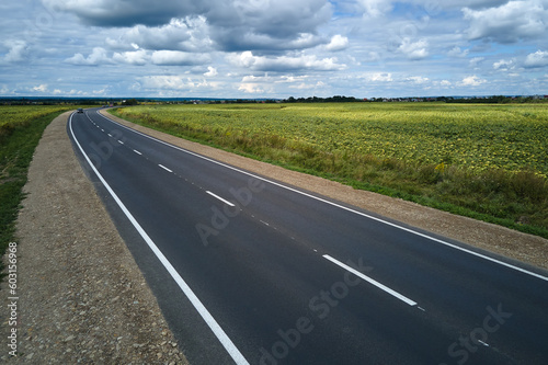 © bilanol, Fototapeta premium Aerial view of empty intercity road between green agricultural fields. Top view from drone of highway roadway