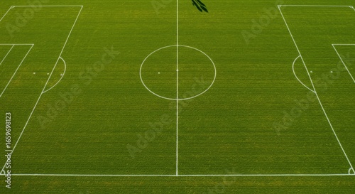 Obraz premium Aerial View of Empty Soccer Field, Green Grass, White Lines, Shadow, Abstract Composition.