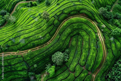 © Dina, Fototapeta premium aerial view of endless tea plantation plants overhead in Asia