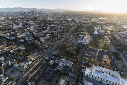Obraz premium Aerial view of Exposition Park, University of Southern California campus, and...