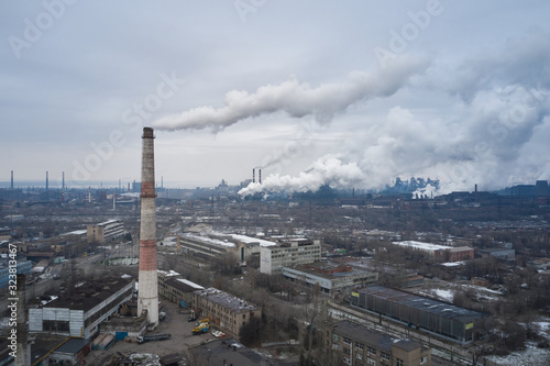 © maksym, Obraz premium Aerial view of factory pipes throwing hazardous emissions into the air.