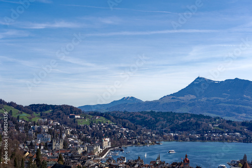 © Michael Derrer Fuchs, Fototapeta premium Aerial view of famous Swiss City of Luzern with Reuss River, Chapel Bridge, Lake Lucerne and Swiss Alps on a sunny spring day. Photo taken March 22nd, 2023, Lucerne, Switzerland.