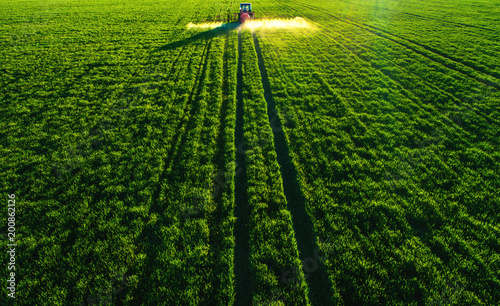 © ValentinValkov, Naklejka premium Aerial view of farming tractor plowing and spraying on field
