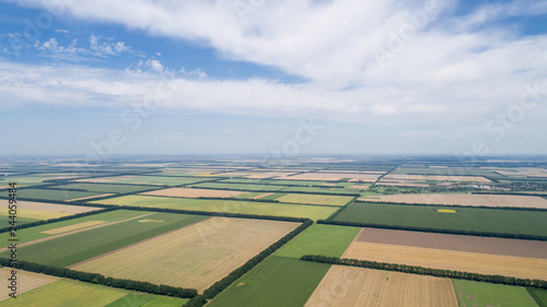 © dechevm, Obraz premium Aerial view of fields with various types of agriculture, against cloudy sky