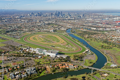 Obraz premium Aerial view of Flemington Racecourse with Melbourne CBD in background...