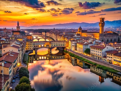 © Danicha, Fototapeta premium Aerial View of Florence, Italy: Arno River Reflections at Sunset