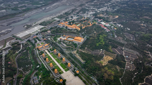 © Dave, Fototapeta premium Aerial view of Fo Guang Shan Buddha Complex in Taiwan highlighting its vast grounds