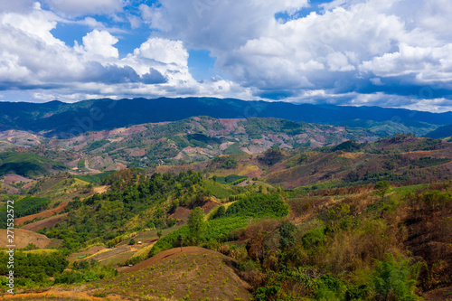 Fototapeta premium Aerial view of forest destroyed by agriculture of shifting cultivation on mountains.