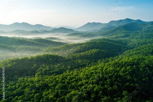 Fototapeta premium Aerial View of Forest Hills with Morning Mist and Mountain Scenery