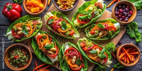 Fototapeta premium Aerial View of Fresh Lettuce Wraps with Colorful Ingredients Perfectly...
