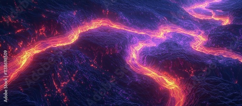 © Galaxyd, Fototapeta premium Aerial view of glowing lava flowing through a dark, rocky landscape.