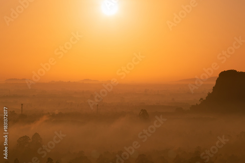 © Kawee, Obraz premium Aerial view of golden morning light and mountains.