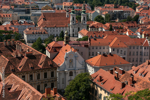 © ElenaIvanova, Fototapeta premium Aerial View Of Graz City Center. Church of Trinity, Mariahilfkirche, tiled roofs of city buildings