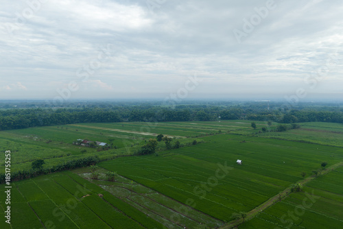 © hafazara, Fototapeta premium Aerial view of green agricultural fields and fertile soil plots bordered by tropical trees in a rural landscape. Scenic farming area in Indonesia.