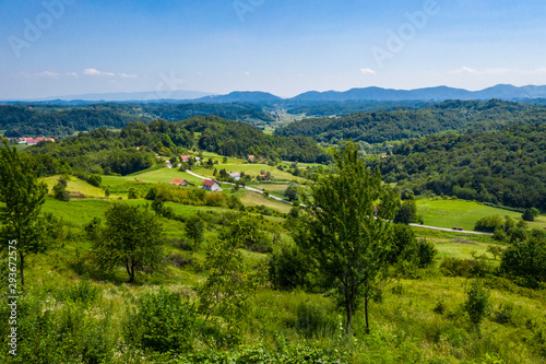 Fototapeta premium Aerial view of green hills and nature in Zagorje, northern Croatia on sunny...