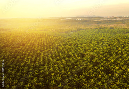 © nelzajamal, Fototapeta premium Aerial view of green palm plantation during sunset with flare effect.