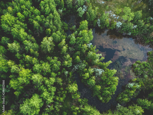 Obraz premium Aerial view of green spring forest with trees and swamp in wetland, spring nature landscape background top view