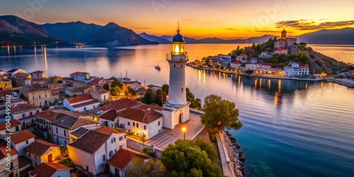 © Arnada, Naklejka premium Aerial View of Gytheio Town Lighthouse and Coastal Houses in the Peloponnese Region of Greece at Dusk