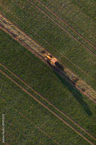 Obraz premium aerial view of harvest fields with tractor