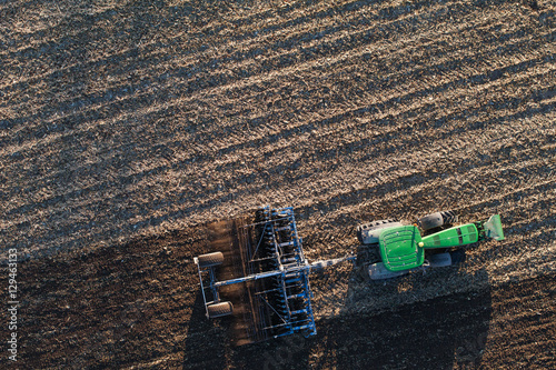 © mariusz szczygieł, Naklejka premium aerial view of harvest fields with tractor in Poland