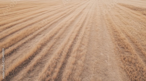 Naklejka premium Aerial view of harvested wheat field, showing parallel lines from harvesting...