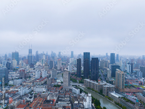 Obraz premium Aerial view of heavily polluted city skyline and buildings at sunrise in Shanghai
