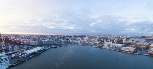 © raland, Fototapeta premium Aerial view Of Helsinki city from the sea. Sunset Evening Illuminations. Scenic winter view of the Old Port from the air. Finland.