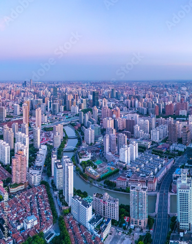 © Shengyi Lu, Fototapeta premium Aerial view of high-rise buildings and residential houses on the Bund in Shanghai
