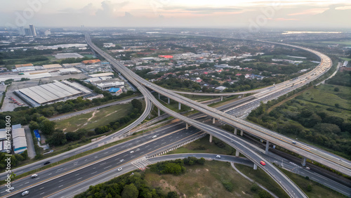 © Mehran, Naklejka premium Aerial view of highway interchange with multiple roads and overpasses for efficient transportation network