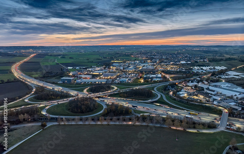 © Uwe, Fototapeta premium aerial view of Highway intersection Stuttgart North connecting German Highways A81 and B10 during rushour at dawn, Baden Württemberg, Germany