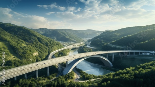 Fototapeta premium Aerial view of highway road bridge for vehicular transport as part of infrastructure development built over valley with green forest trees and hills connecting towns during sunset