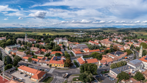 Obraz premium Aerial view of historic Szecseny town on the Hungarian Slovakian border with...