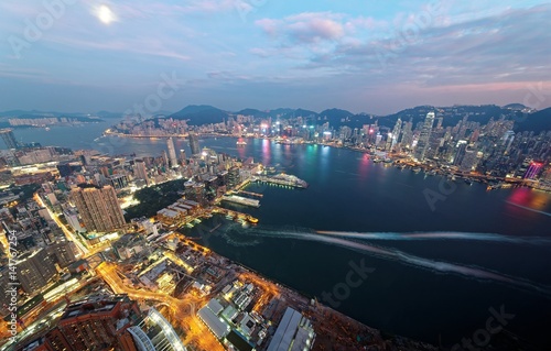 © AaronPlayStation, Fototapeta premium Aerial view of Hong Kong & Kowloon (Tsim Sha Tsui) at night with city skyline of crowded skyscrapers by Victoria Harbour & light trails of ships across seaport~ Cityscape of Hong Kong in blue twilight