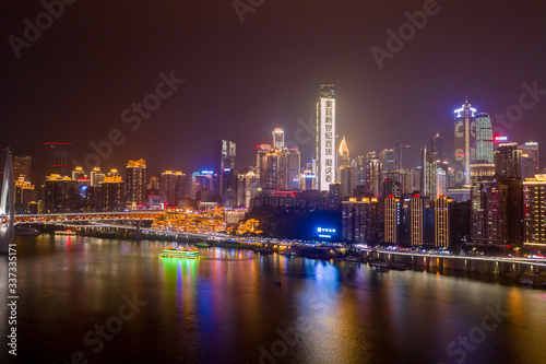 © davidzzzfr, Fototapeta premium Aerial view of Hong Ya dong Cave, Historic Chinese folk religion town by Jialing River with lighted skyscrapers