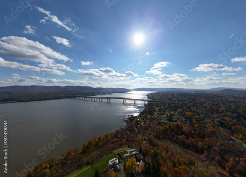 Obraz premium Aerial view of Hudson River with strong sunlight reflecting off the water near Newburgh, NY, showcasing surrounding autumn foliage and deep blue skies. Travel photography.