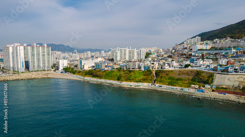 Obraz premium aerial view of Huinnyeoul Culture Village in Busan, Korea. The picture showcases a coastal village with a terraced landscape, colorful buildings, and a beautiful seafront.