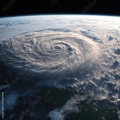 © Duskcraft, Fototapeta premium Aerial View of Hurricane Swirling Over Earth From Space Vantage Point Dramatic Weather Phenomenon