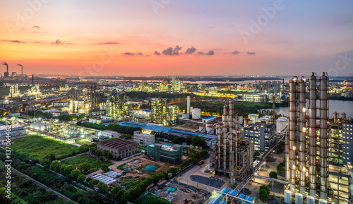 © zhao dongfang, Obraz premium Aerial view of illuminated oil refinery at dusk with industrial zone waterfront and colorful sky background