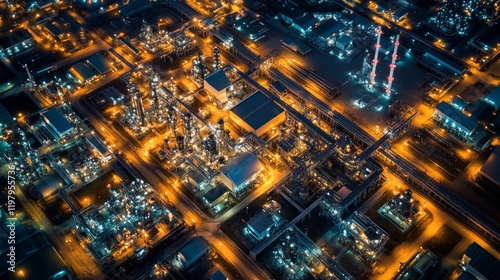 © euthan, Obraz premium Aerial View of Industrial Complex at Night with Bright Lights
