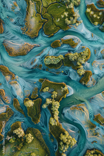Fototapeta premium Aerial view of intricate water patterns and vegetation in wetlands, creating...