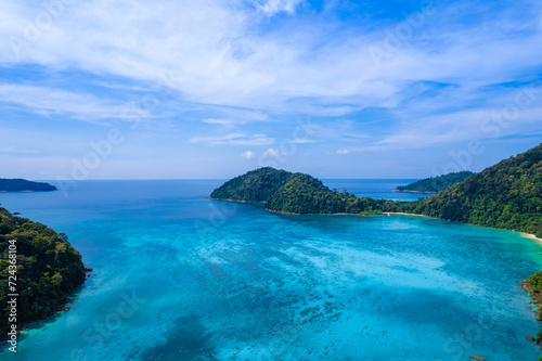 © Photo Sesaon, Fototapeta premium Aerial view of Island in the Andaman Sea. natural blue sea Tropical seas of Thailand The beautiful scenery of the island is very impressive.