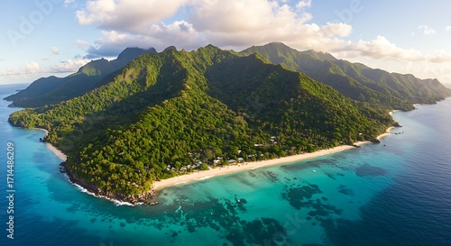 © 彭若强, Fototapeta premium Aerial View of Island Mountains and Blue - Green Coast