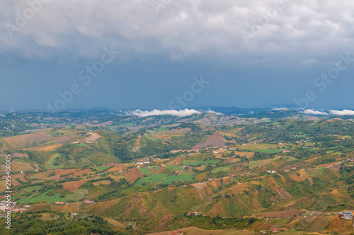 © Olga K, Fototapeta premium Aerial view of Italian countryside with farm fields and hills