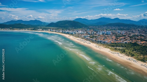 © MUCHIB, Fototapeta premium Aerial View of Itapema Beach, Brazil: Turquoise Waters, Golden Sands, and Mountain Backdrop