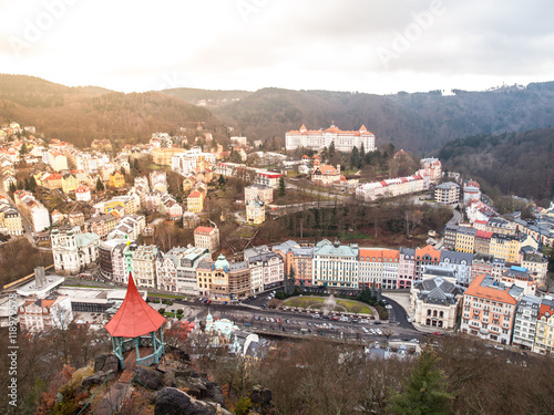 Naklejka premium Aerial view of Karlovy Vary with spa, residential buildings and hotels in the...