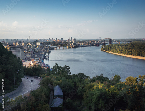 Obraz premium Aerial view of Kyiv Embankment and Dnieper River with Kyiv bridges on...
