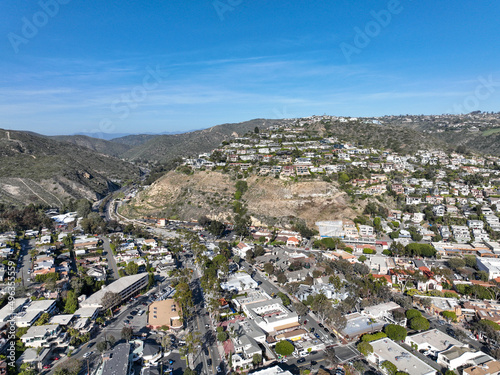 Naklejka premium Aerial view of Laguna Beach coastline town with vilas on the hills, Southern...