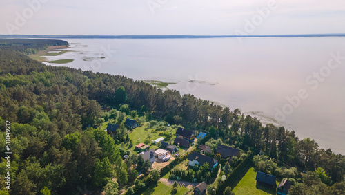 Obraz premium Aerial view of lake and small village. Village near the lake. Aerial view of the village and trees on the shore of lake.